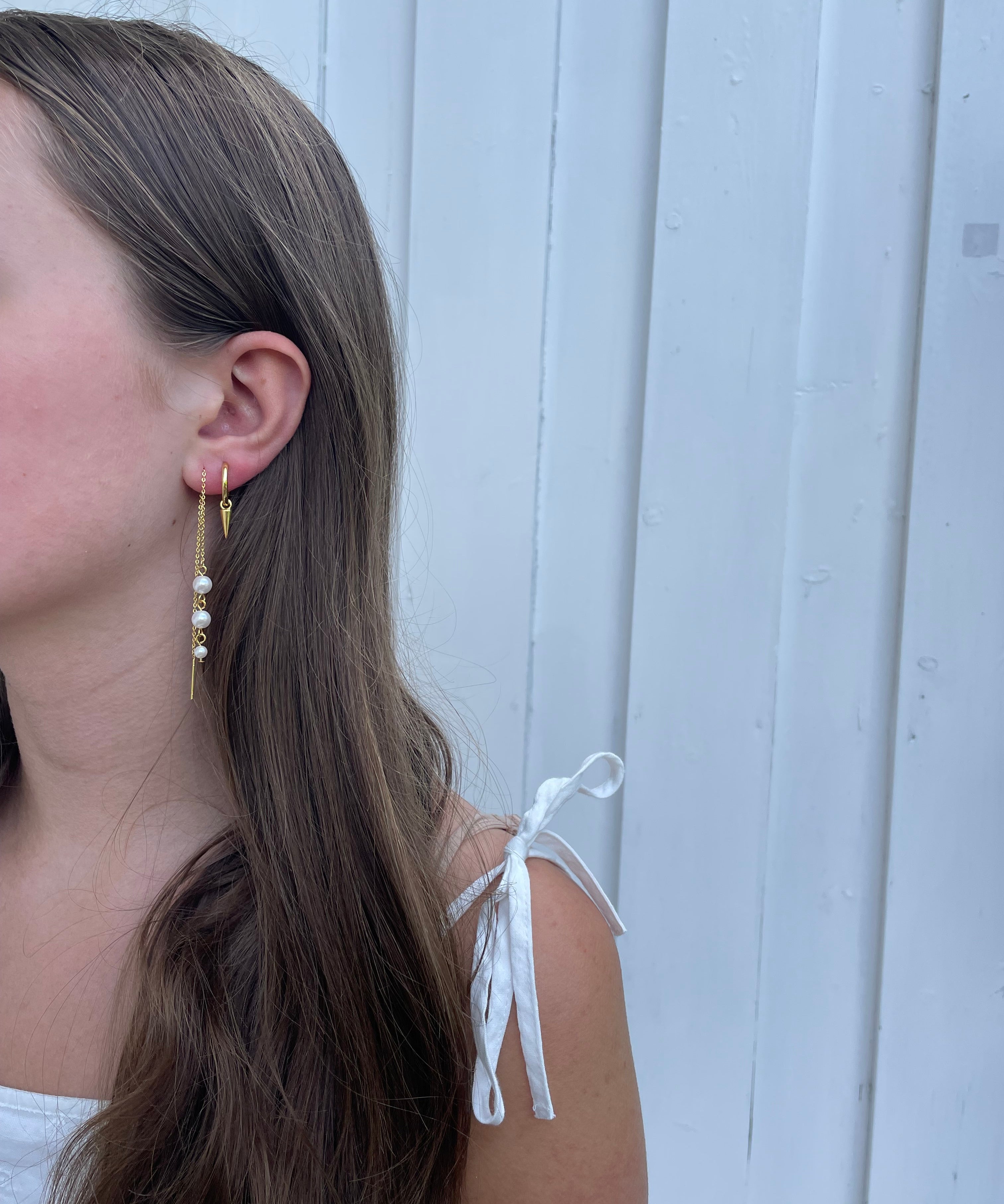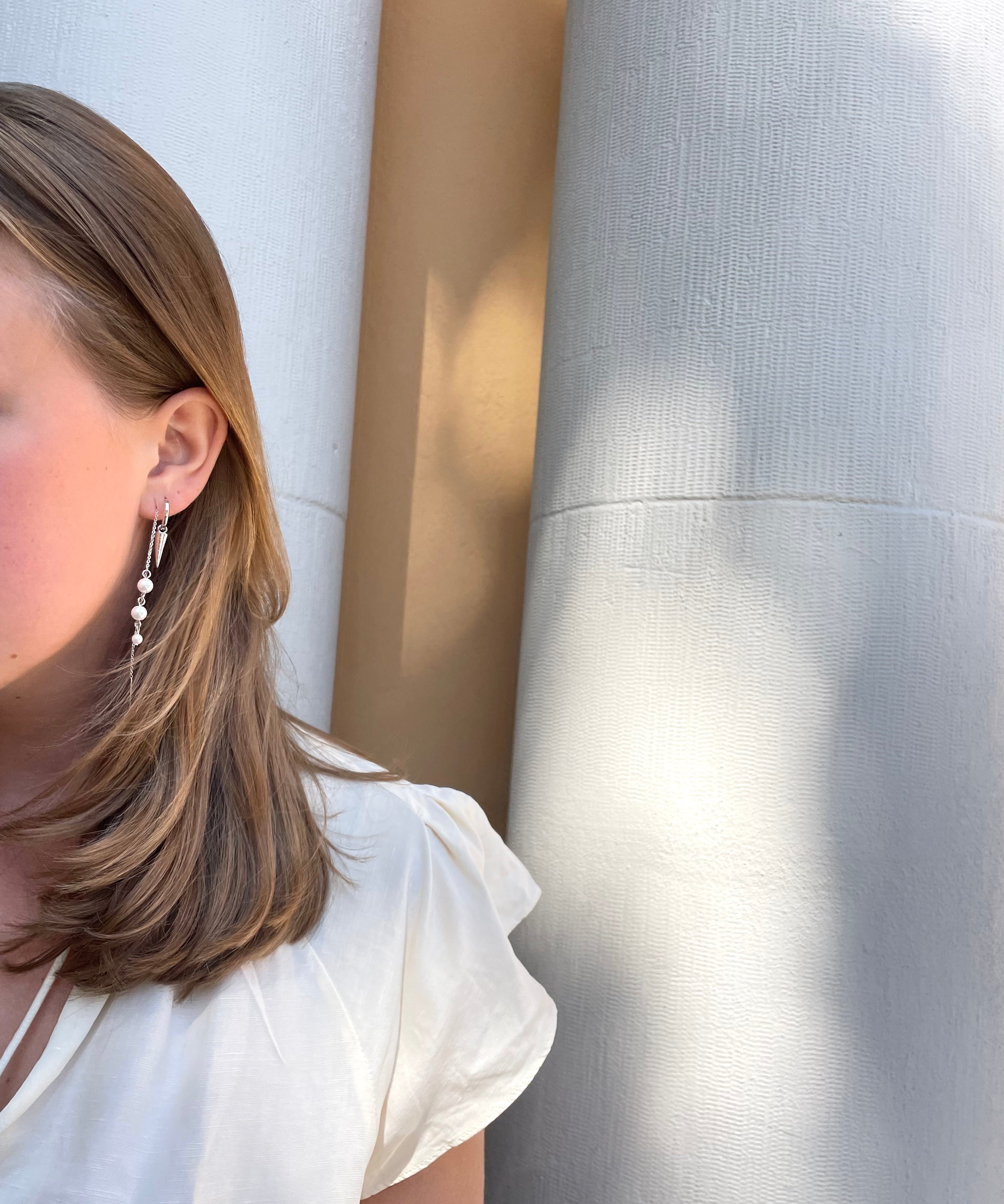 Adora Earrings in silver with pearl and spike, worn in side angle